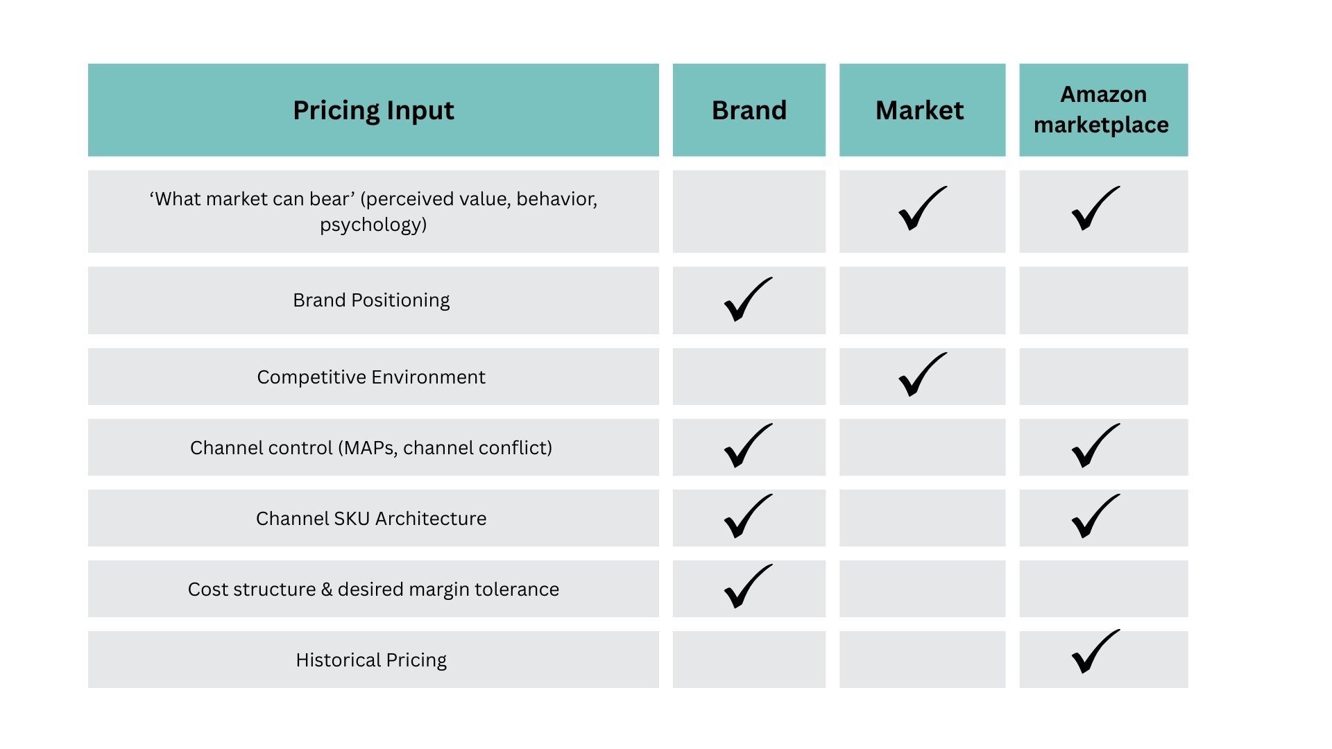 Here is how I see pricing inputs must be viewed on Amazon, so you as a business owner or CxO can see the big picture of where these factors originate from and how they intersect with your strategy: